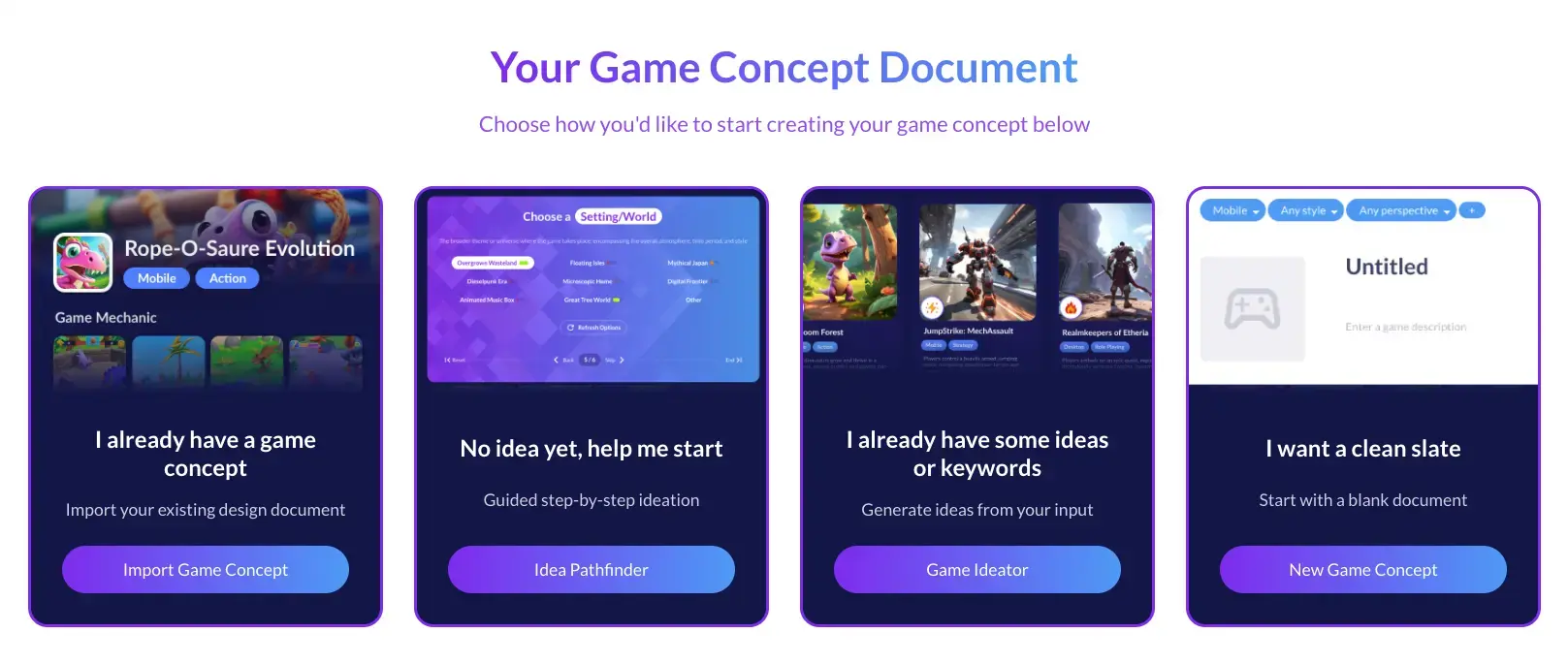 Got some keywords or rough ideas? Toss them into the Game Ideator and let it generate full concept suggestions based on your input.