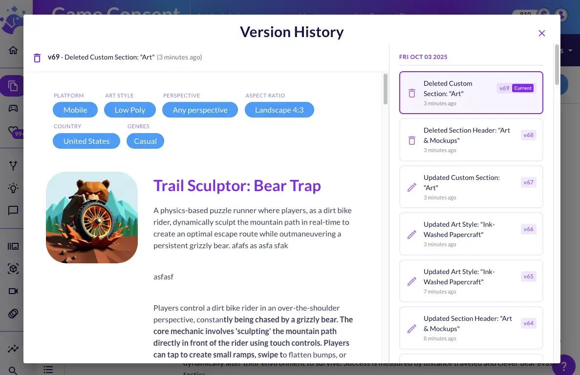 The structured approach gives every piece of information a clear home. Art style? Same place every time. Target platform? Update once, it updates everywhere. That specific mechanic from last week? Instantly findable. Collapse the sections you're not working on right now, focus on what matters.