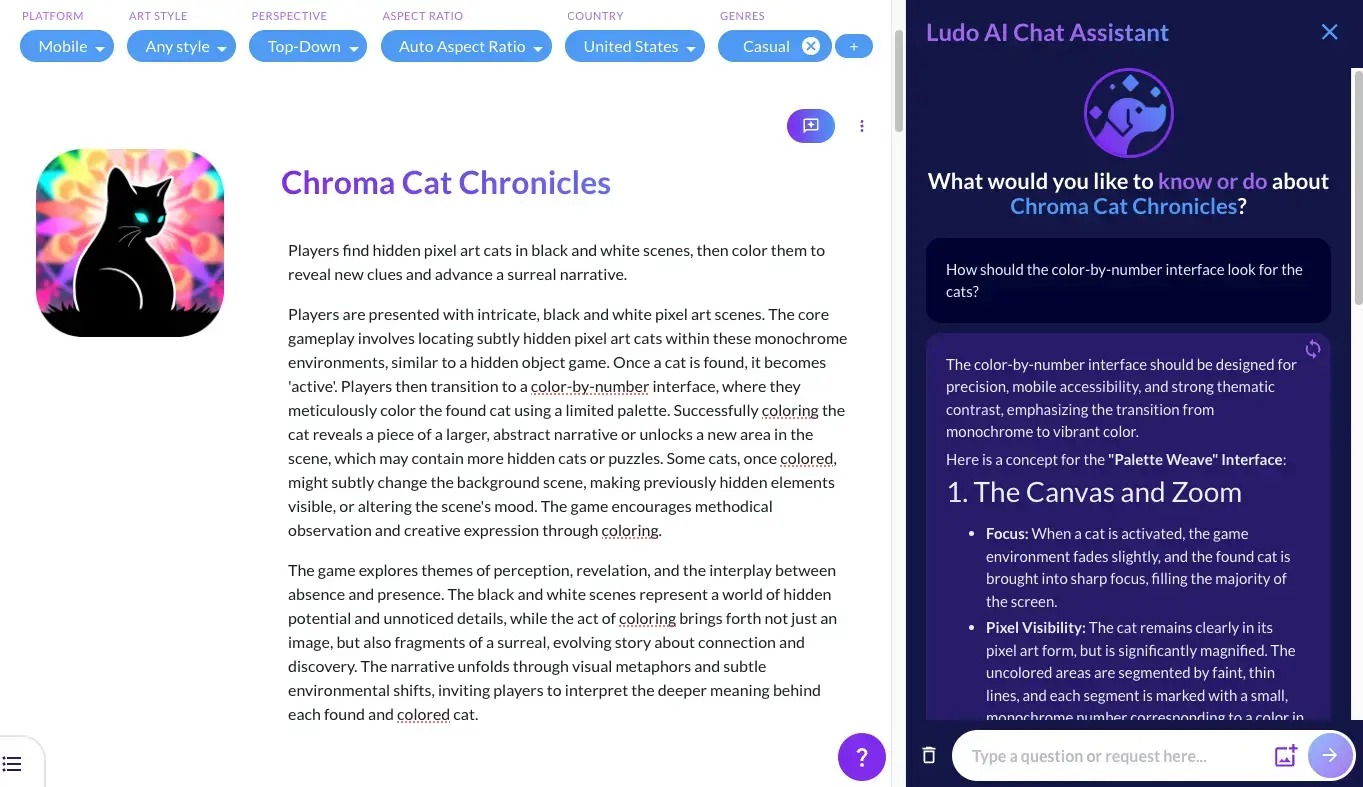 Beyond browsing pre-generated content, you can actually have a conversation with Ludo about your game.
