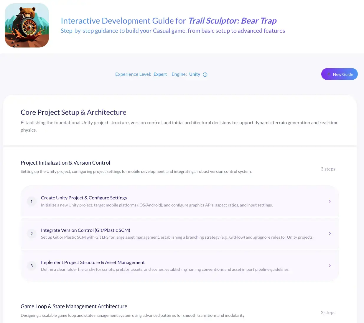 Switch to the Development Guide tab and get AI-powered, step-by-step plans tailored to your specific concept. Not generic advice--concrete next steps for your game. What to build first, how to structure milestones, which technical risks to mitigate early. The AI reads your complete GDD and gives you actionable guidance.