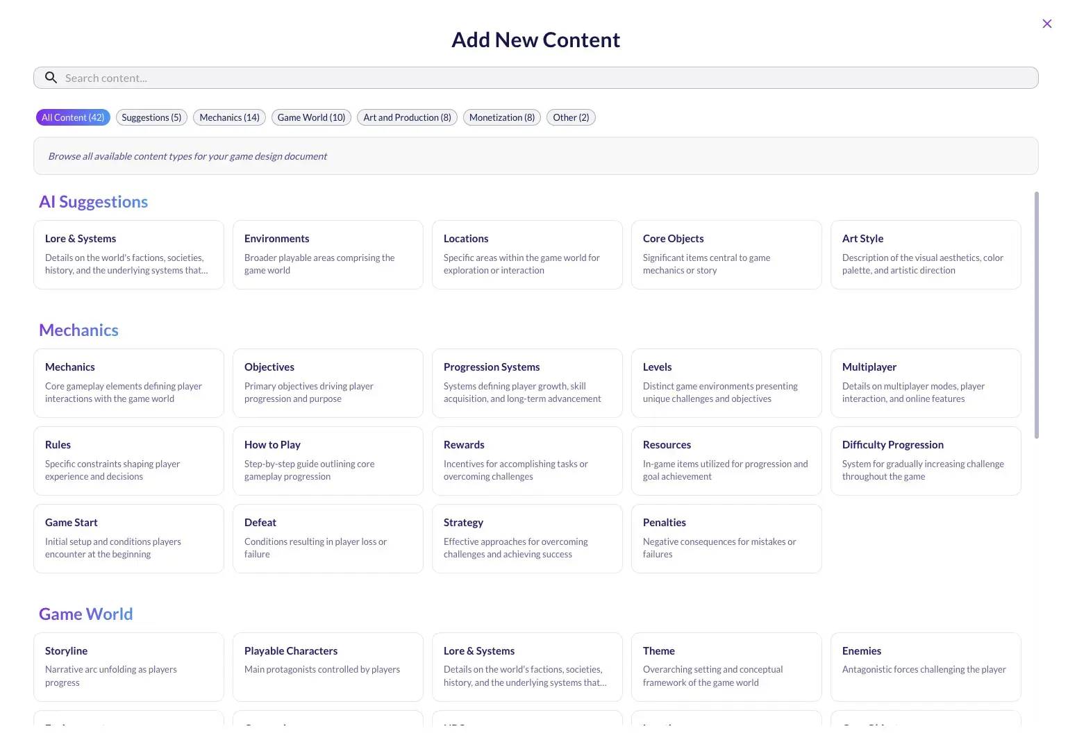 This is the feature that'll save you the most time. Every section in your GDD can pull from an AI-generated content library that's tailored to your specific game.