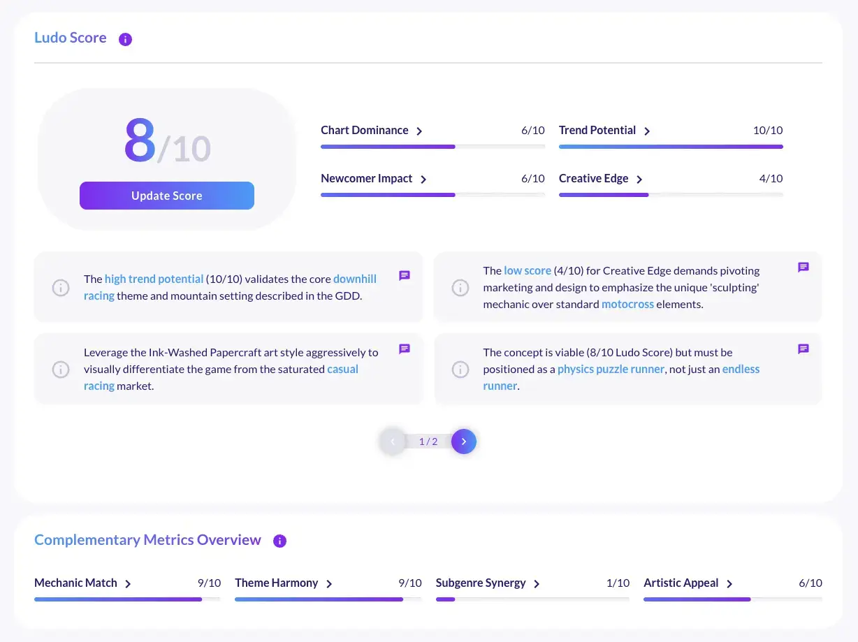 The Game Concept tool integrates with Ludo's market analysis. As you build your GDD, you can check real data: