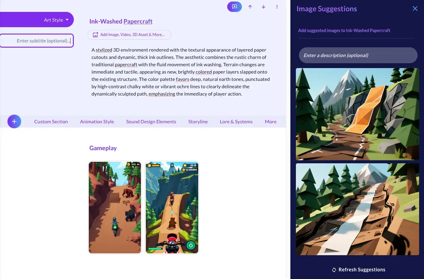 Select a section, open the side panel, and browse through multiple AI-written options that fit your game's genre, platform, and style. Not templates--actual custom writing. Need images for your character section? Sprites for animation? 3D models? They're all there. Just drag what you want into your document.