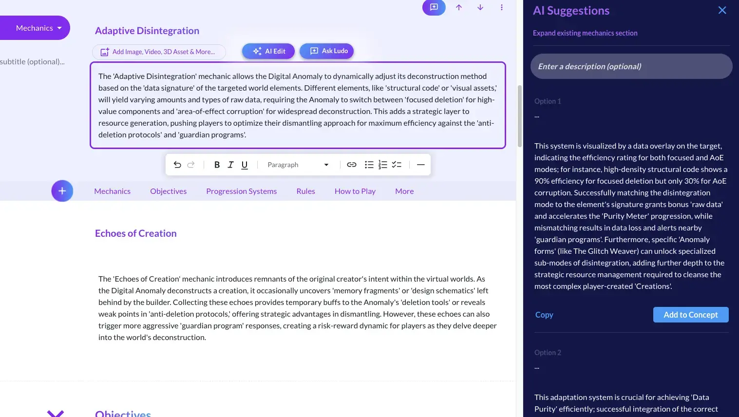 Ludo's AI doesn't write your game for you--it amplifies what's already in your head. Stuck articulating your combat system? The AI suggests frameworks that spark new directions. Need to flesh out monetization? Get market-informed options based on successful games in your genre. Vague ideas become fully-formed sections.